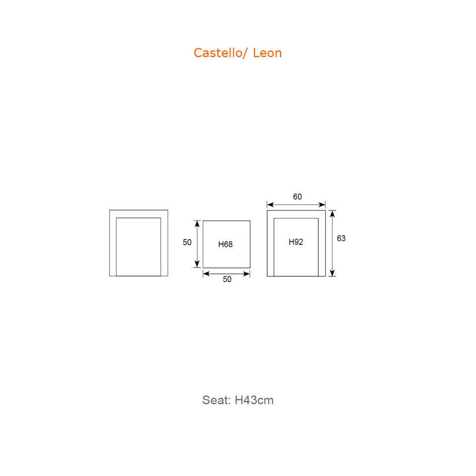 De afmetingen van de Castello stoel zijn 80 x 75 x H87,5 cm, met een zithoogte van 44 cm.