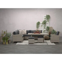 De Alora lounge dining set 5-delig rechts met donker grijze kussens is een echte eyecatcher voor de tuin. Deze set is te herkennen aan haar ronde armleuningen en de rope details. De lounge dining set is van kwaliteitsmerk Garden Impressions.