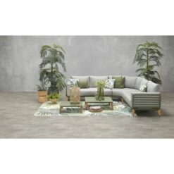 Modern loungeset welke gemaakt is van duurzame materialen. De Hilton loungeset wordt geleverd met hoekbank, hocker en loungestoel. Hiermee is de set geschikt voor 6 personen. Het frame van de loungeset is gemaakt van aluminium, om dit frame is het kunststof wicker gevlochten in de kleur Organic grey. De Garden Impressions Hilton loungeset wordt geleverd met comfortabele loungekussens. De kussens hebben een vuil- en waterafstotende coating en kunnen dus tegen een klein regenbuitje. Wanneer u de Hilton loungeset niet in gebruik heeft adviseren wij wel om de kussens op een droge en geventileerde plek op te bergen.