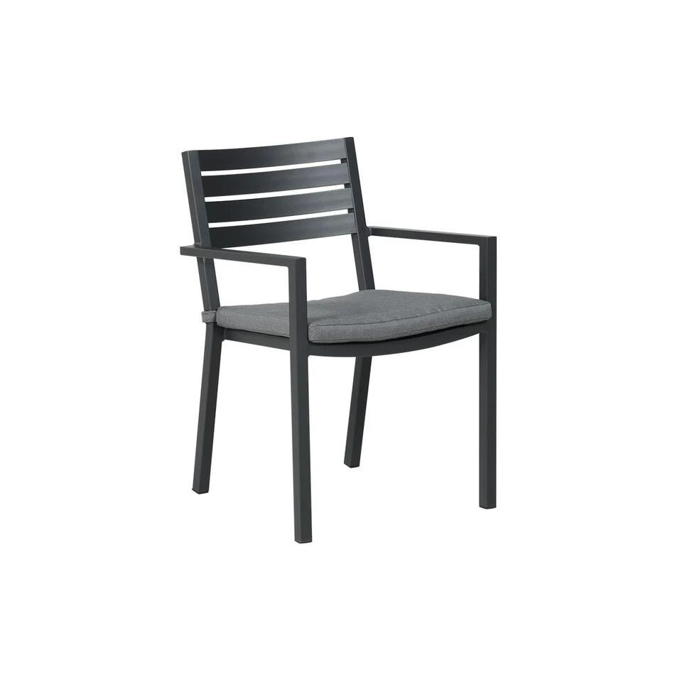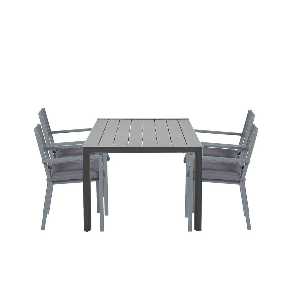De Adana tuintafel heeft een afmeting van 180 bij 100 cm en 76.5 cm hoog. De Amarillo stapelbare tuinstoel wordt geleverd inclusief kussen. De afmetingen van de tuinstoel zijn 56,5 x 55 en is 81 cm hoog.