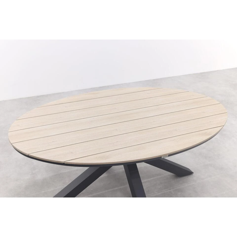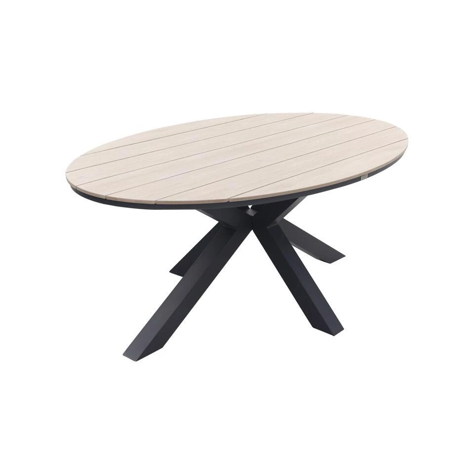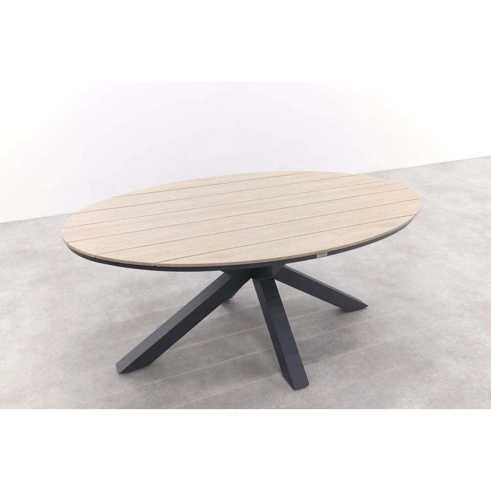 Het unieke kruisonderstel is gemaakt van stevig aluminium en behandeld met een antracietkleurige coating. Deze coating zorgt ervoor dat het frame kras- en stootvast is. Aluminium is een lichtgewicht materiaal dat niet kan verroesten, weinig onderhoud nodig heeft en jarenlang meegaat. Het tafelblad van de Edison tuintafel is gemaakt van polywood latten in een ovale vorm. Polywood is een soort kunststof met de uitstraling van hout. Bij polywood dien je wel rekening te houden met het plaatsen van glaswerk, bloempotten etc. Lees hiervoor het onderhoudsadvies.
