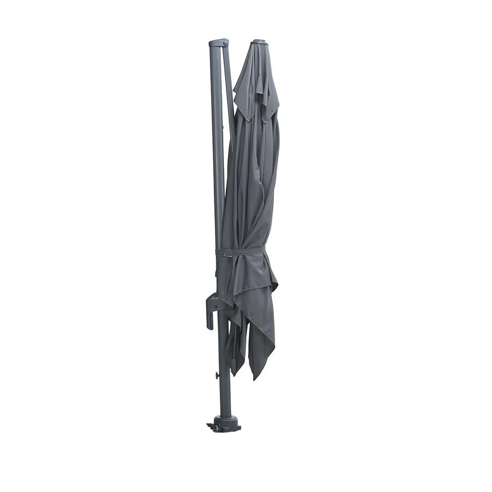 De zweefparasol is verticaal te kantelen en 360 graden rond te draaien. Ideaal om met de zon mee te bewegen zonder de hele parasol te moeten verplaatsen. Bij deze zweefparasol moet minimaal een 80 kg hawaii parasolvoet. De zweefparasol is licht van gewicht en kan makkelijk opgeborgen worden in de schuur wanneer er slecht weer aan komt. Doe je de parasol ’s avonds dicht dan kun je er een hoes over heen doen, die los aangeschaft kan worden. Het parasoldoek heeft een donker grijze kleur.