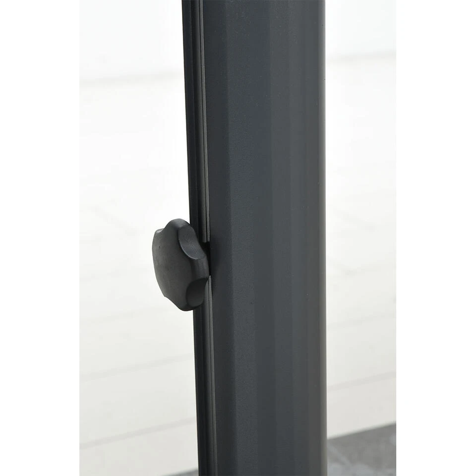 Zo is het frame gemaakt van stevig aluminium met een donker grijze coating. Het doek is gemaakt van 200 grams polyester en ook nog eens voorzien van een brandwerende PA-coating. De zweefparasol is verticaal te kantelen en 360 graden rond te draaien.