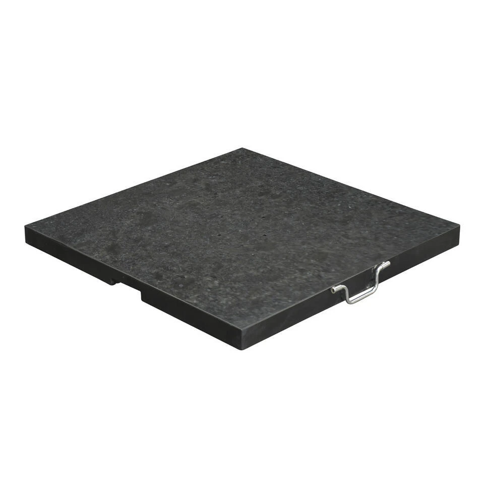 De voet is voorzien van twee nylon wielen met aan de andere zijde een RVS handvat, waarmee je de parasolvoet kunt verplaatsen. Kortom, de stijlvolle look van hoogwaardig natuursteen met het gemak van een verrijdbare parasolvoet. Graniet is een natuurproduct wat zijn eigen unieke kenmerken heeft. Het kan voorkomen dat in de granieten parasolvoet een ader van de steen zichtbaar is. Dit doet geen afbreuk aan de kwaliteit van het product.