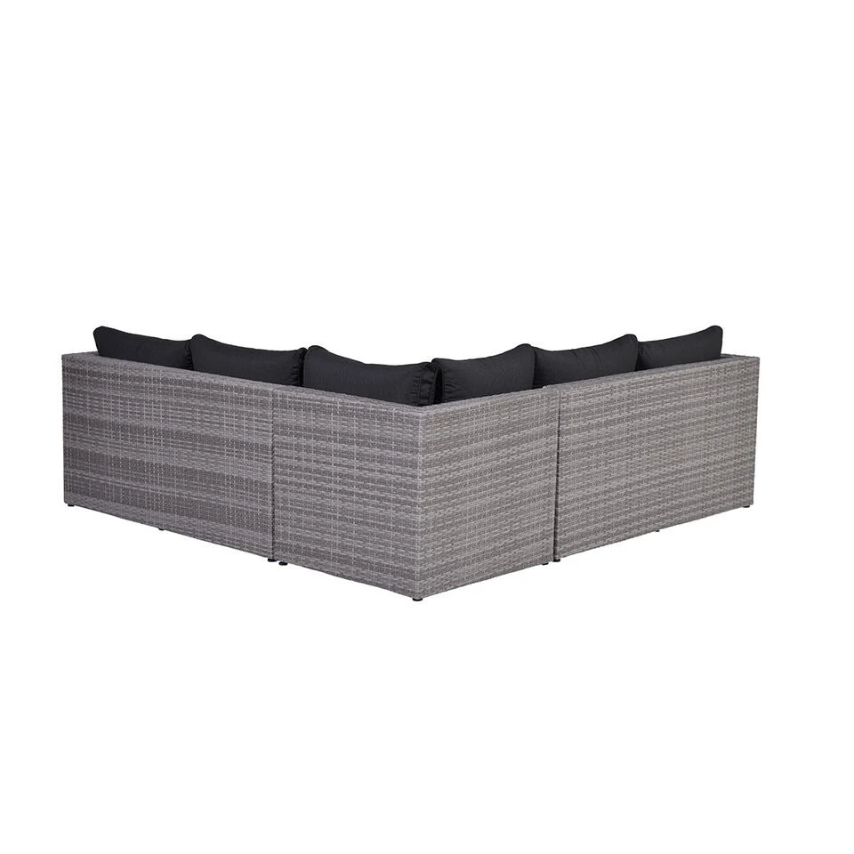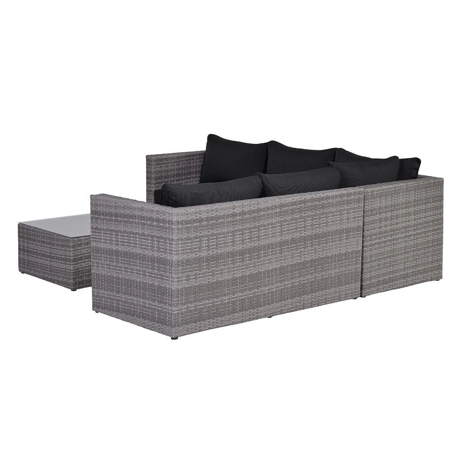 De Lyon loungeset bestaat uit twee ruime lounge bankdelen, één hoek element en één tafel met geharde glasplaat. De losse onderdelen van deze set zijn door middel van clips aan de onderzijde aan elkaar te bevestigen, zodat de elementen niet kunnen verschuiven. Deze weerbestendige set is gemaakt van een stevig aluminium frame met daaromheen een kwalitatief wicker vlechtwerk draad in de kleur organic grey. Dit wicker is gemaakt van stevig kunststof waardoor de set zeer duurzaam is.