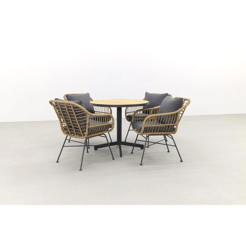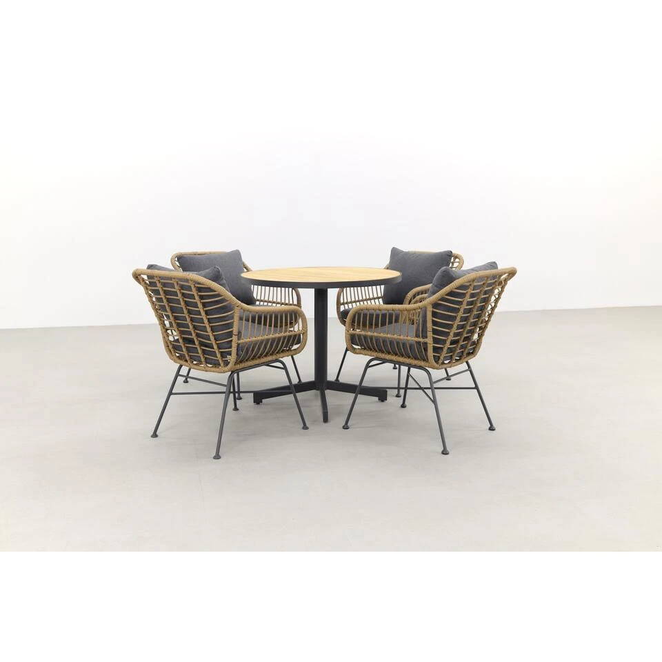Op zoek naar een ronde tuinset met een retro uitstraling? Dan is dit de juiste tuinset voor jou! Deze Margriet diningstoelen zorgen voor die echte retro look. Dit komt door het wicker dat voor deze stoel gebruikt is in de natuurlijk rotan kleur. Hierdoor krijg je echt het gevoel van vroeger! De Fiesta tuintafel maakt het plaatje compleet met haar onbehandelde teakhouten tafelblad en donkere frame. Doordat de doorsnede van deze tafel 90 cm. is past deze tuinset ook in de kleinere tuin of terras!