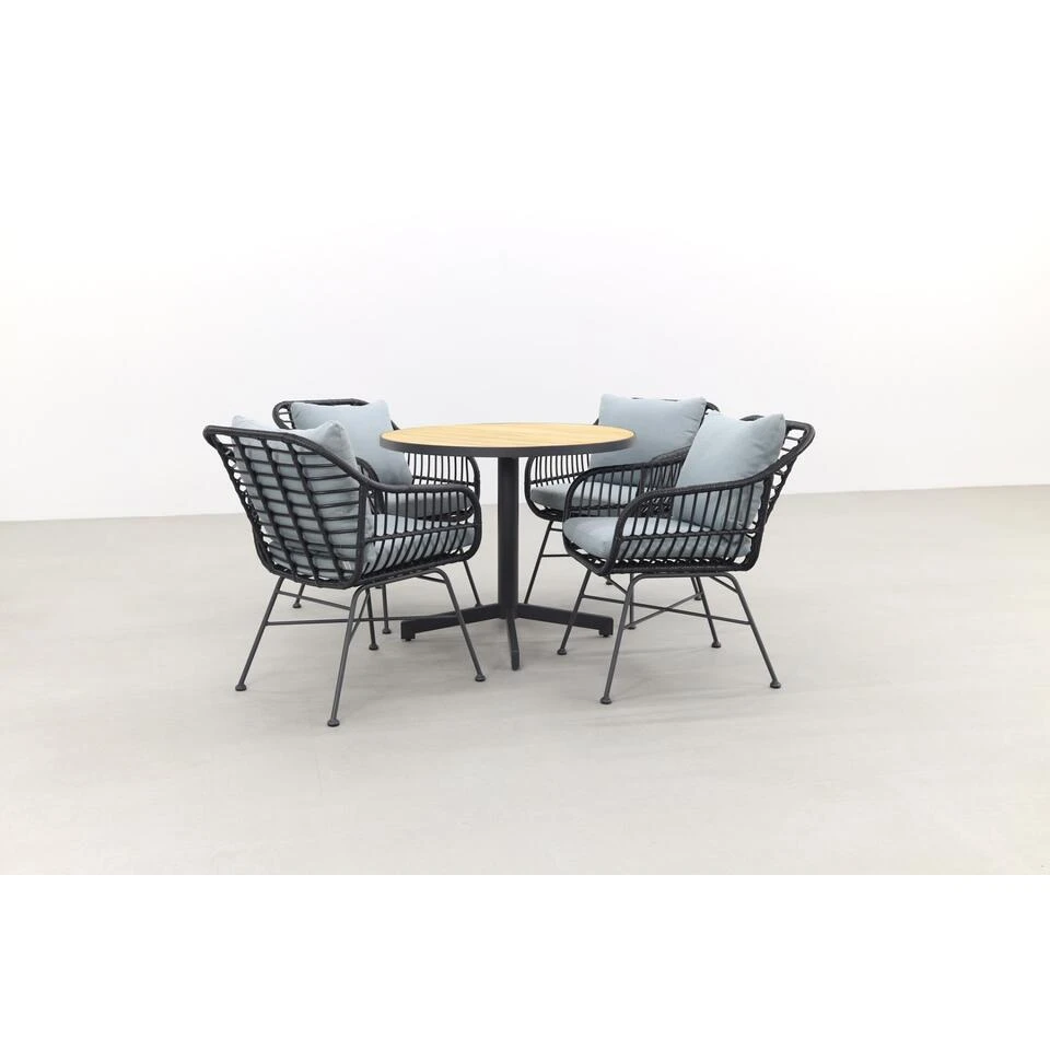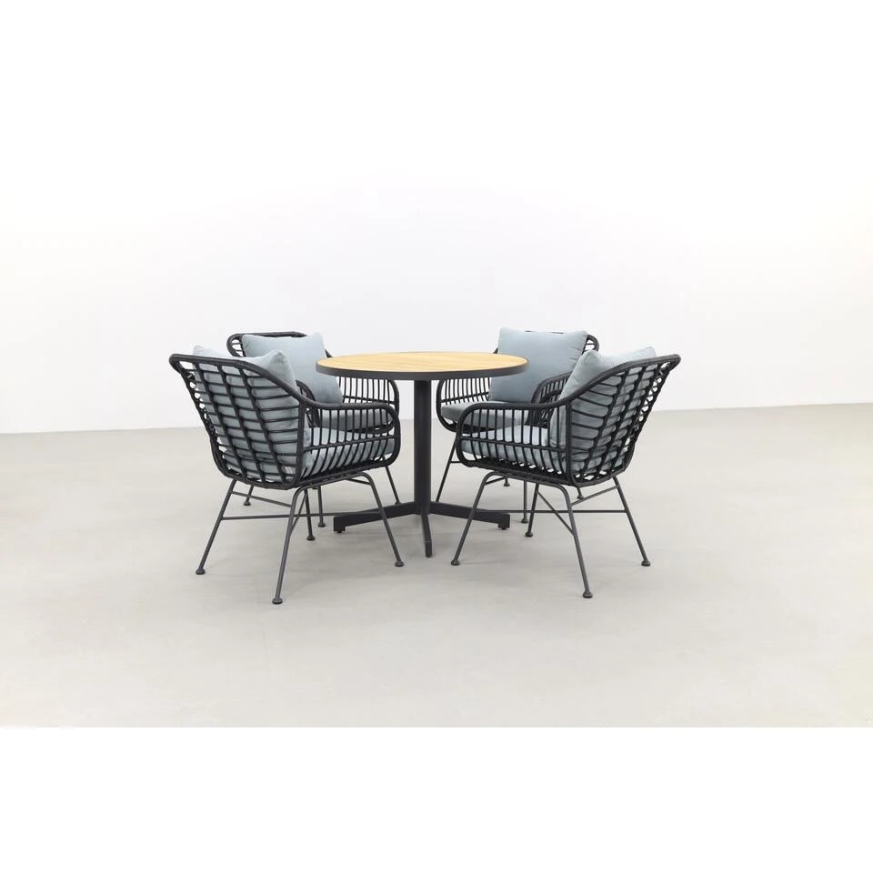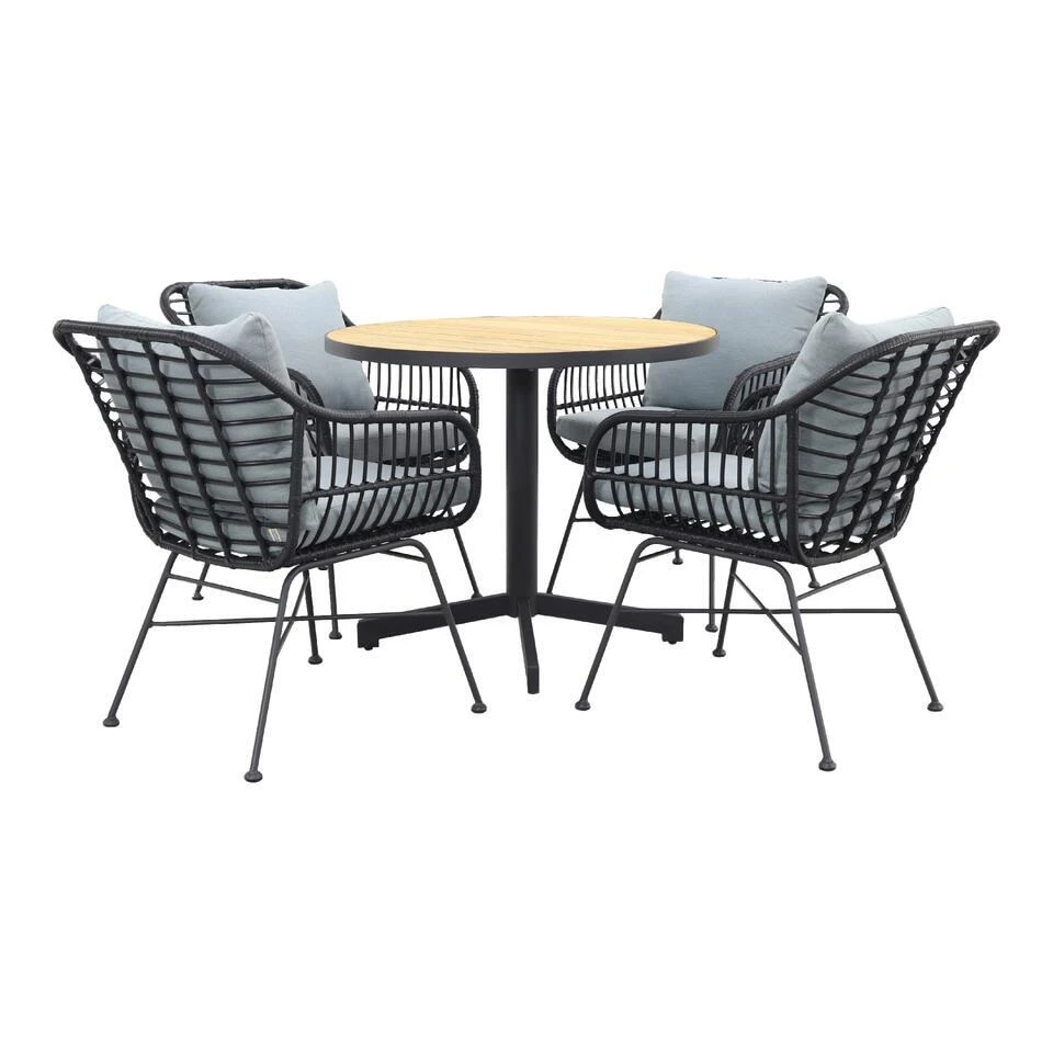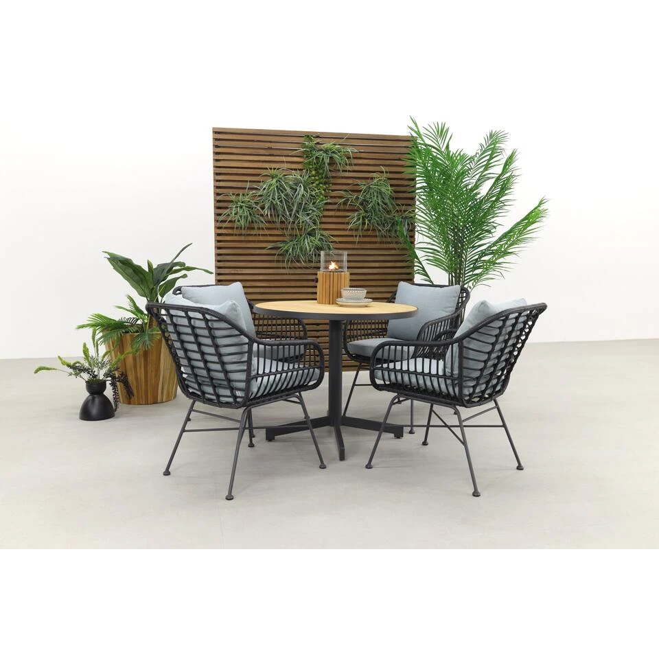Wil jij graag een compacte tuinset met een opvallende uitstraling? Dan zit je goed met deze Margriet/Fiesta tuinset! De ronde Fiesta tafel met teakhouten tafelblad springt er echt tussenuit. Door de doorsnede van 90 cm. past deze tuintafel ook nog eens in de kleinere tuin of terras. Perfect als je niet al te veel ruimte hebt. De Margriet tuinstoelen hebben een unieke uitstraling die helemaal tot zijn recht komt in deze set. De kuip van zwart rotan wordt gecomplimenteerd door de mint grey tuinkussens die standaard worden meegeleverd. Je hebt direct een echte blikvanger in je tuin staan!