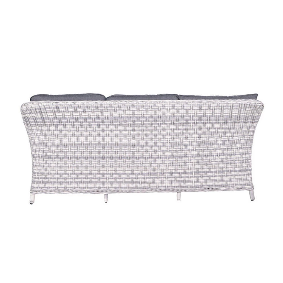 Deze driezits bank is vervaardigd uit onderhoudsvrij aluminium frame en weerbestendig half rond wicker kunststof vlechtwerkdraad in de kleur cloudy grey. Het draad heeft een dikte van maar liefst 5mm, wat zorgt voor een mooie robuuste uitstraling. Wicker is een stevig en duurzaam kunststof, waardoor je jarenlang kunt genieten van deze set.