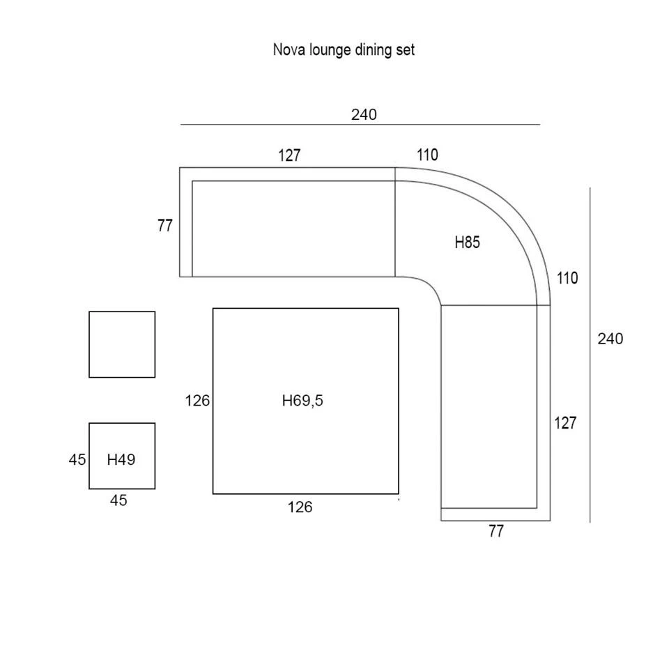 Bij deze Nova lounge dining set zijn verschillende tafels mogelijk. De Nova lounge dining tafel die er perfect bij past heeft een polywood tafelblad. Polywood is een weerbestendig kunststof en gemakkelijk in onderhoud. Lounge dining set wordt volledig gemonteerd geleverd en de bank delen zijn gemakkelijk aan elkaar te bevestigen door de meegeleverde clips. Nova lounge dining set is een populaire loungeset en kan daarom met verschillende elementen worden uitgebreid. Zo is er bijvoorbeeld een midden element om de hoekbank te vergroten, stoelen voor extra zitplekken of praktische krukjes. En natuurlijk zijn er nog vele andere artikelen in dezelfde kleurstelling leverbaar.