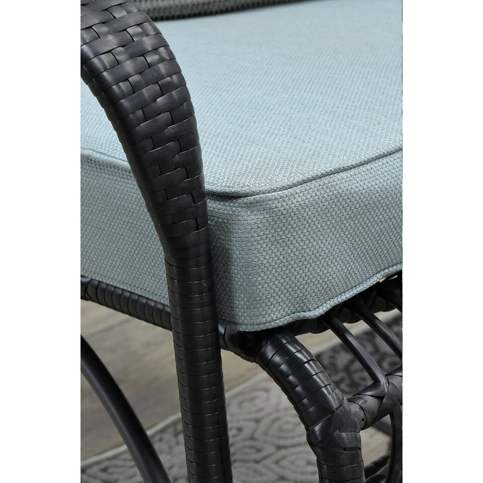 De Olaf loungeset is vervaardigd uit een onderhoudsvrij aluminium met daaromheen hand gevlochten weerbestendig zwart wicker, wat zorgt voor een elegante uitstraling.