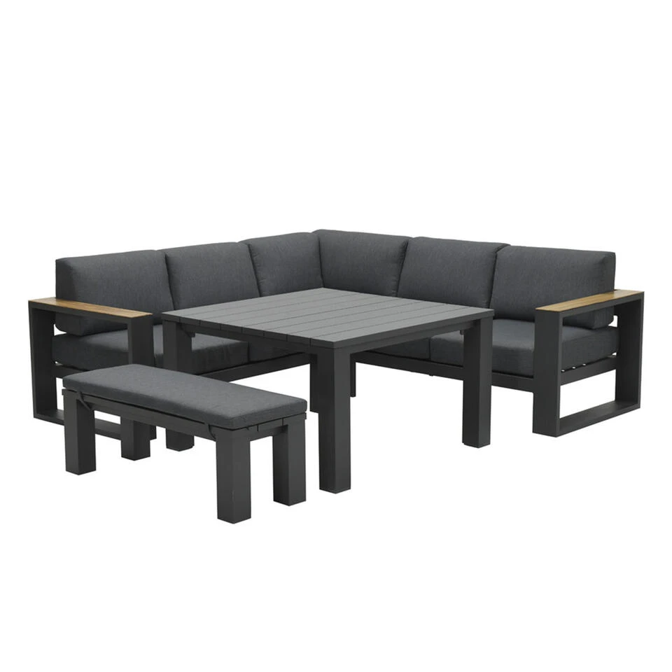 De Plaza 5-delige lounge dining set is een strakke aluminium loungeset.