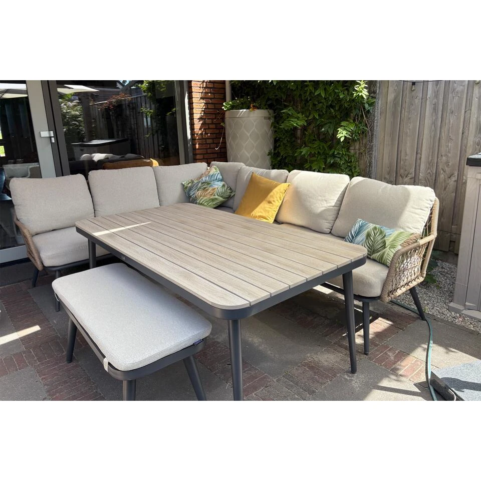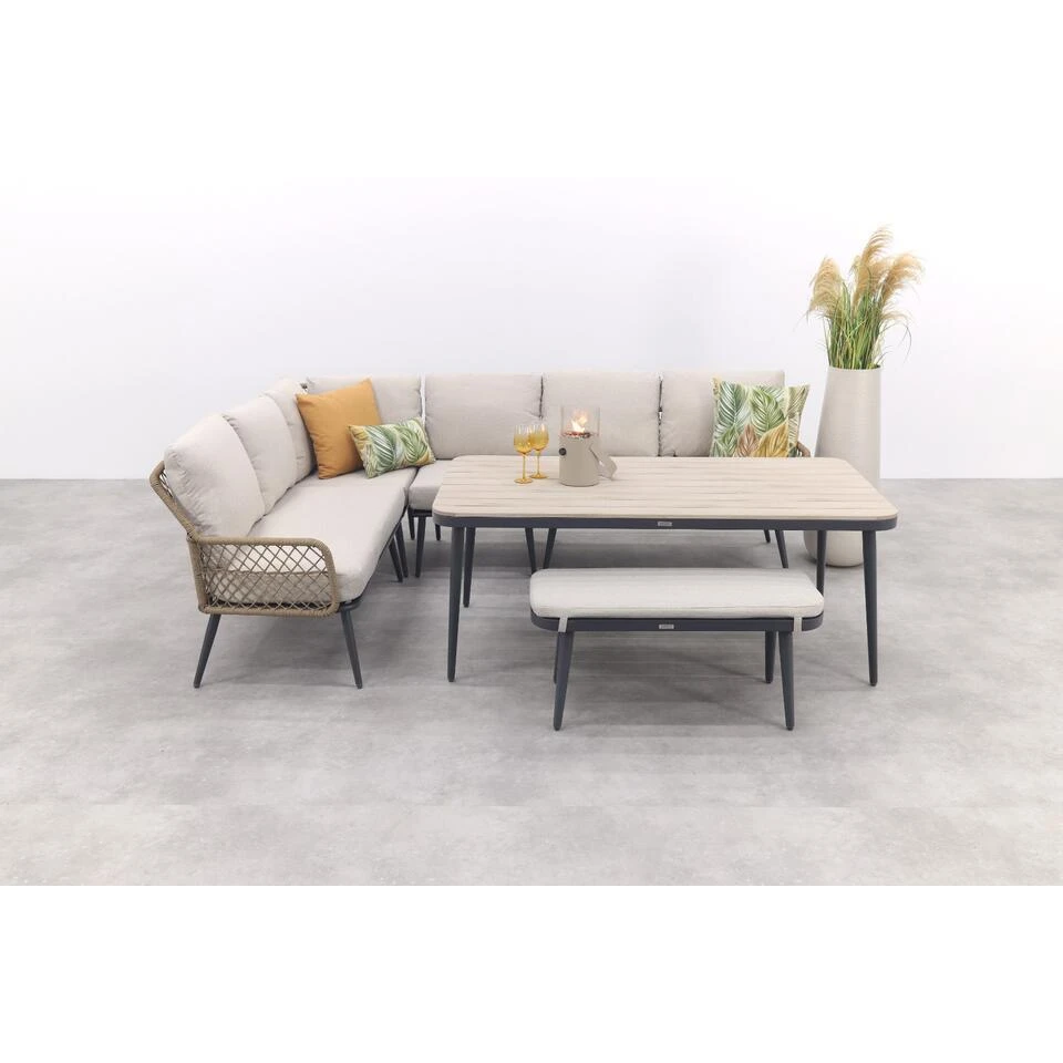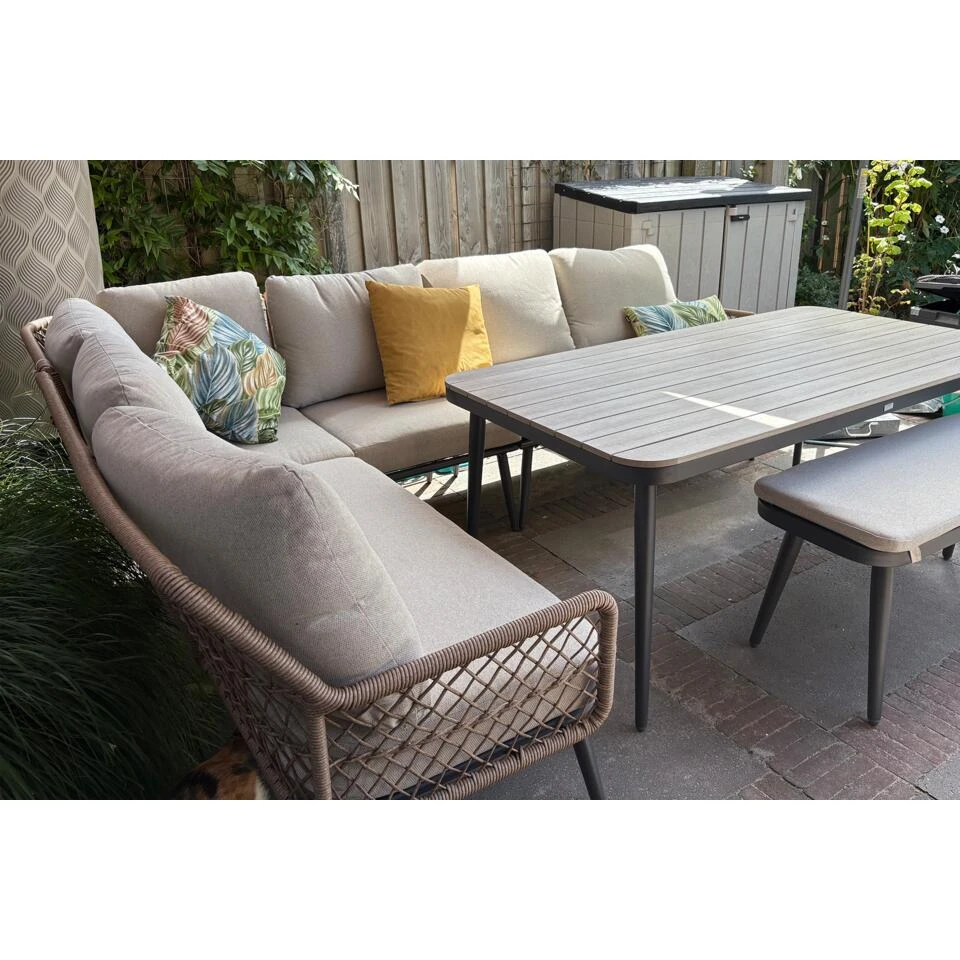 Creëer een sfeervolle buitenruimte met de veelzijdige GI Allasio lounge-dining hoekset! Deze set combineert stijl en functionaliteit, waardoor je zowel kunt ontspannen als gezellig kunt dineren. De ruime set biedt plaats voor een gezelschap van 8 personen! Dankzij de ideale tafelhoogte is de Allasio perfect voor een ontspannen kop koffie of een uitgebreid diner. Het unieke design met rope-details geeft een speelse retro-uitstraling, terwijl de warme tinten een uitnodigende sfeer creëren. Het houtlook tafelblad matcht prachtig met het stoere donkergrijze frame, wat zorgt voor een moderne en eigentijdse uitstraling.