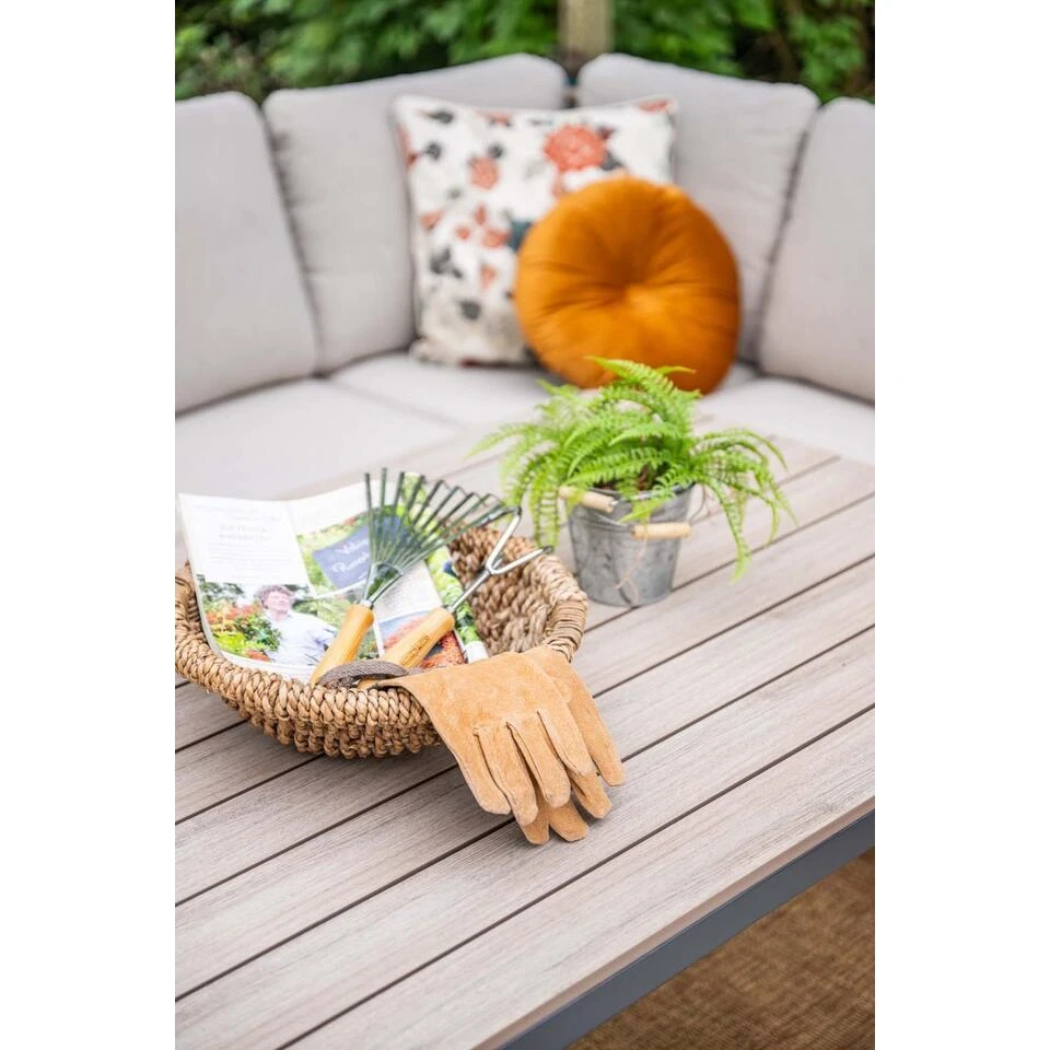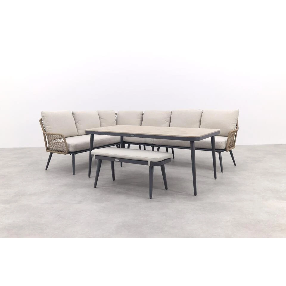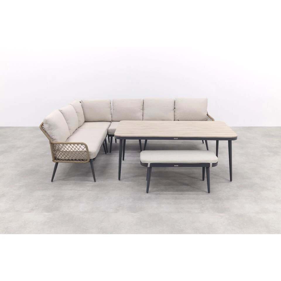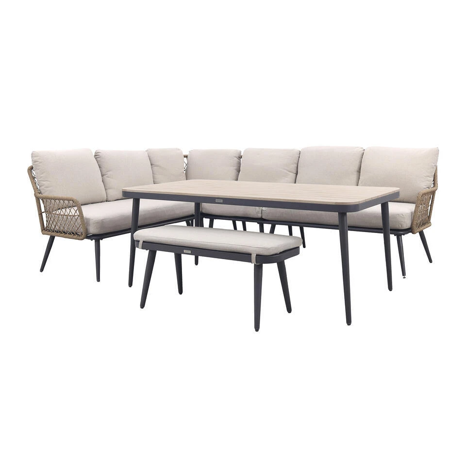 Creëer een sfeervolle buitenruimte met de veelzijdige GI Allasio lounge-dining hoekset! Deze set combineert stijl en functionaliteit, waardoor je zowel kunt ontspannen als gezellig kunt dineren. De ruime set biedt plaats voor een gezelschap van 8 personen! Dankzij de ideale tafelhoogte is de Allasio perfect voor een ontspannen kop koffie of een uitgebreid diner. Het unieke design met rope-details geeft een speelse retro-uitstraling, terwijl de warme tinten een uitnodigende sfeer creëren. Het houtlook tafelblad matcht prachtig met het stoere donkergrijze frame, wat zorgt voor een moderne en eigentijdse uitstraling.