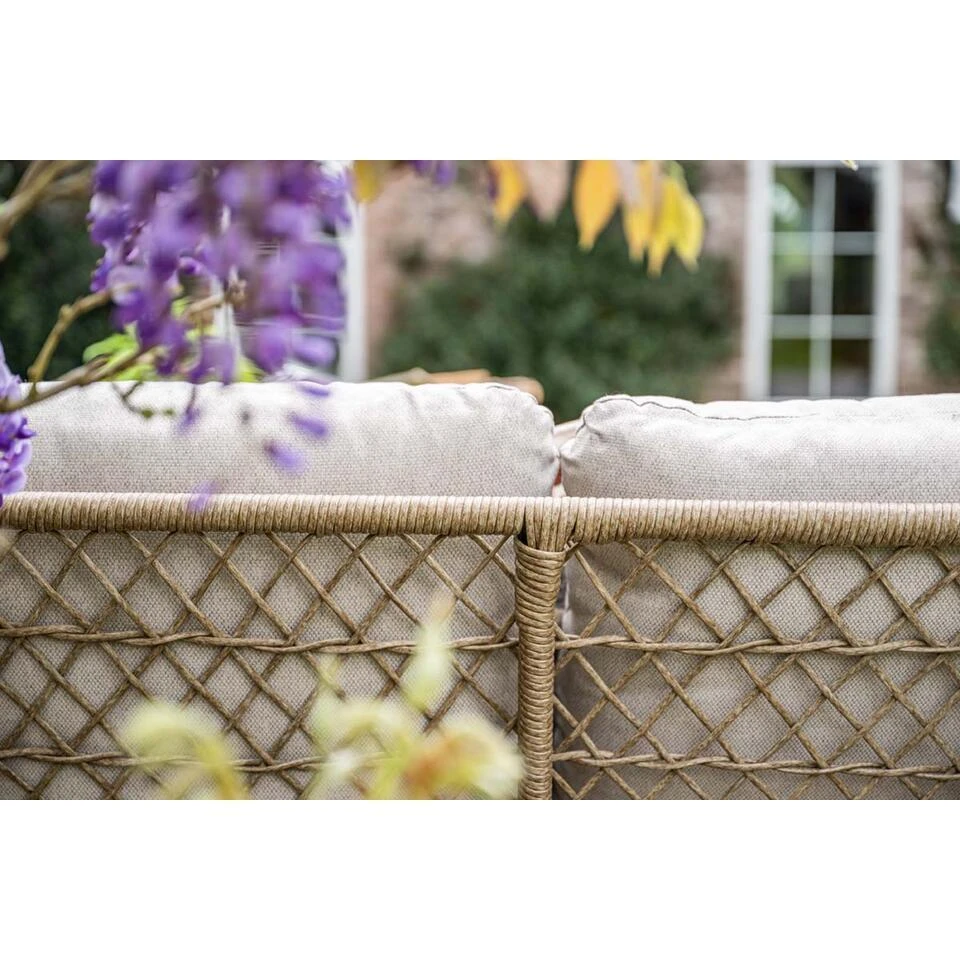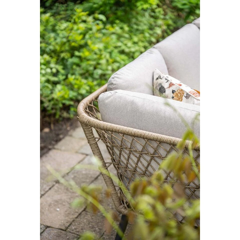 De GI Allassio lounge-dining hoekset combineert elegantie met duurzame materialen. Het aluminium frame is licht van gewicht en voorzien van een poedercoating, wat zowel een moderne uitstraling als bescherming tegen weersinvloeden biedt. Het zitgedeelte onderscheidt zich door een verfijnd touwpatroon van rope, een sterk kunststof materiaal dat doet denken aan wicker. Deze weerbestendige loungeset is gemakkelijk te reinigen en ontworpen voor langdurig gebruik. Voor optimaal plezier wordt aangeraden de kussens op te bergen wanneer ze niet in gebruik zijn.