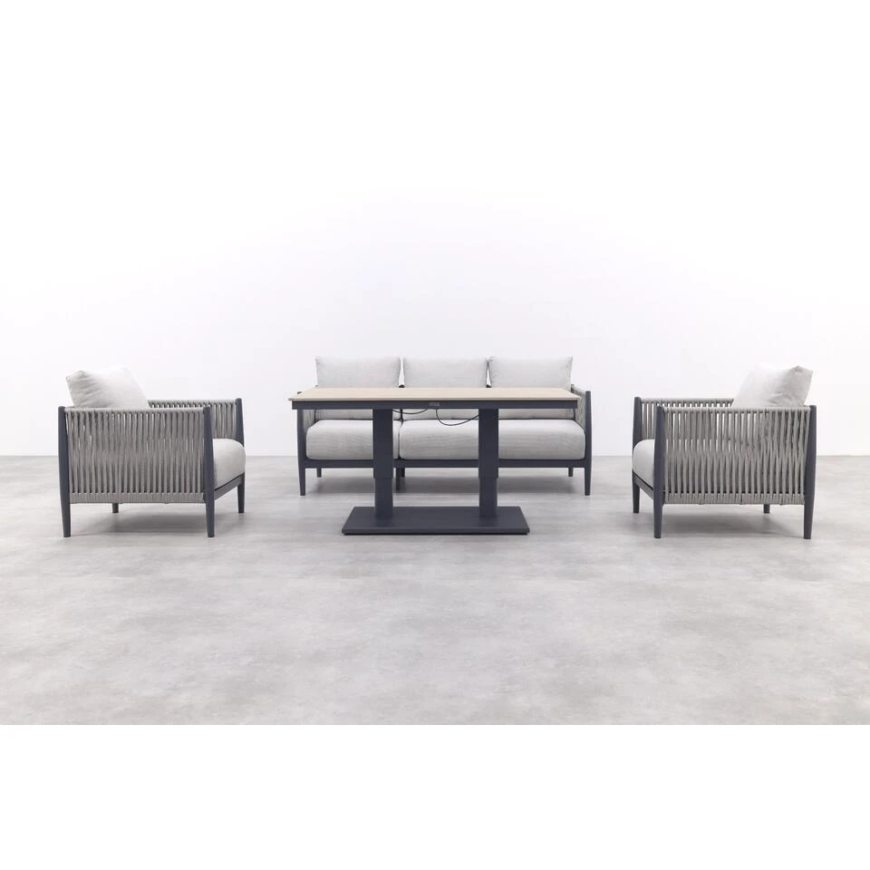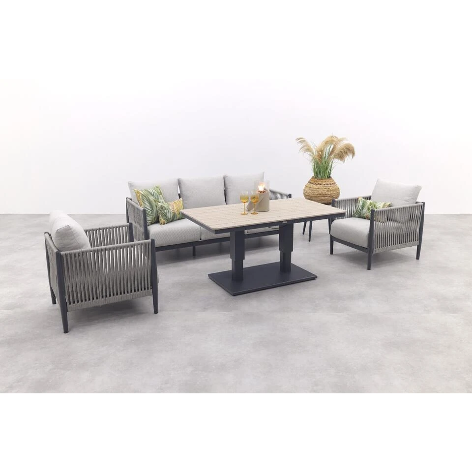 Met de GI Diamo/Cyprus verstelbare stoel/bank lounge-diningset kun je de sfeer in je tuin helemaal naar wens instellen. Je kunt namelijk door de losse loungemeubelen zelf de opstelling bepalen, net zoals de hoogte van de tafel kun je aanpassen naar wens. Wil je een lage loungetafel of toch liever iets hoger, zodat je kunt dineren in de buitenlucht? Met deze multifunctionele set kan het allemaal. Door de comfortabele kussens wil je niets liever dan urenlang blijven zitten. Het ontwerp van de set voegt een luxe sfeer in jouw buitenruimte. Het aluminium frame heeft een unieke vorm, breder in het midden voor een speelse en opvallende look.