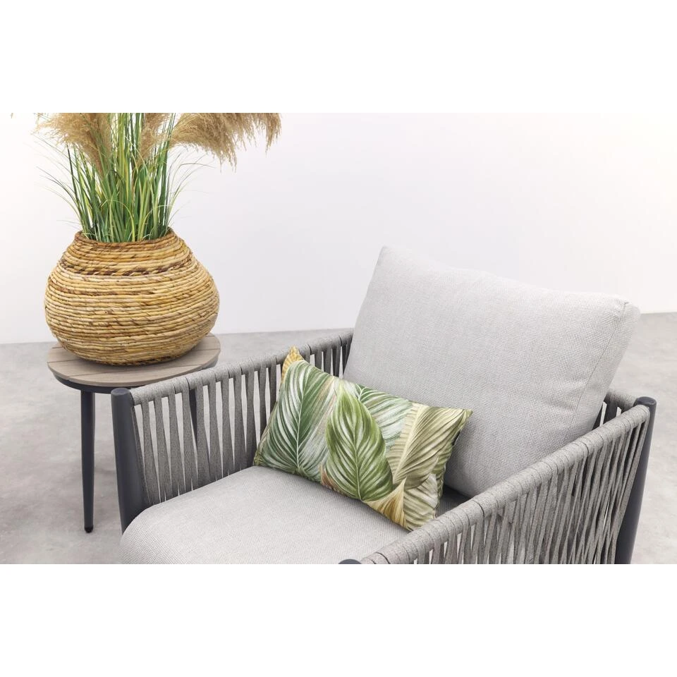 De GI Diamo stoel/bank lounge-dining set bestaat onder andere uit een comfortabele 3-zits loungebank en loungestoelen. Alle loungemeubelen zijn een combinatie van rope en aluminium. Rope zorgt voor het unieke effect van deze stoel/bank lounge-dining set. Rope is een synthetisch touw dat zowel stevig, weerbestendig en onderhoudsvriendelijk is. Het touw wordt om een aluminium frame gevlochten. Dit materiaal biedt voordelen zoals: weerbestendig, stevig en onderhoudsvriendelijk. Het advies is om de meegeleverde comfortabele kussens binnenshuis op te bergen wanneer ze niet worden gebruikt, om hun levensduur te verlengen