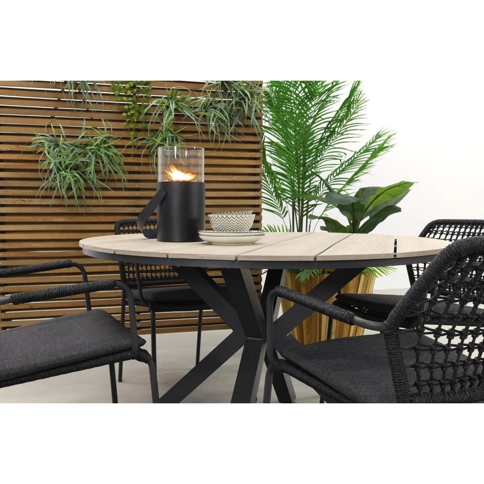 De Edison tuintafel is een ruime tafel met een unieke uitstraling. Met de doorsnede van 122 cm. is de Edison tuintafel perfect geschikt tot 4 personen. Geniet samen met vrienden of familie van een heerlijk diner of gezellige barbecue. De Edison tuintafel heeft een schitterend design in de vorm van een kruisonderstel met een rond tafelblad in houtlook. Het unieke kruisonderstel is gemaakt van stevig aluminium en behandeld met een antracietkleurige coating. Deze coating zorgt ervoor dat het frame kras- en stootvast is. Aluminium is een lichtgewicht materiaal dat niet kan verroesten, weinig onderhoud nodig heeft en jarenlang meegaat. Het tafelblad van de Edison tuintafel is gemaakt van polywood latten in een ronde vorm. Polywood is een soort kunststof met de uitstraling van hout. Bij polywood dien je wel rekening te houden met het plaatsen van glaswerk, bloempotten etc. Lees hiervoor het onderhoudsadvies.