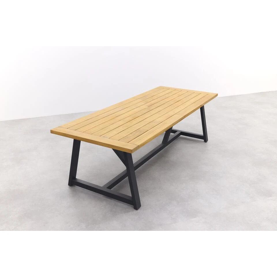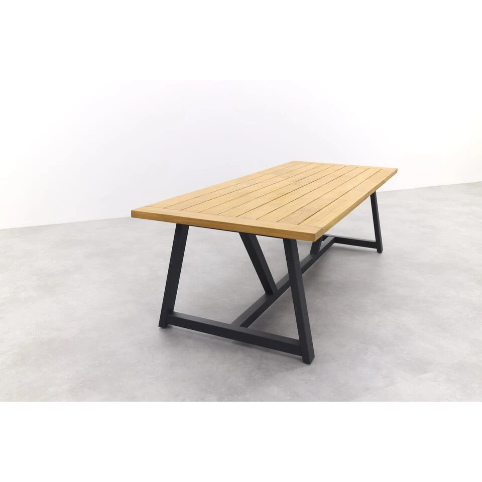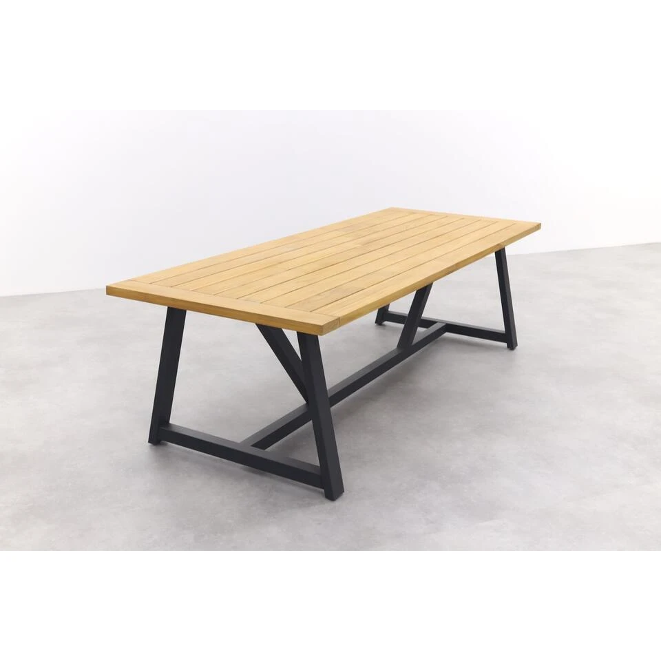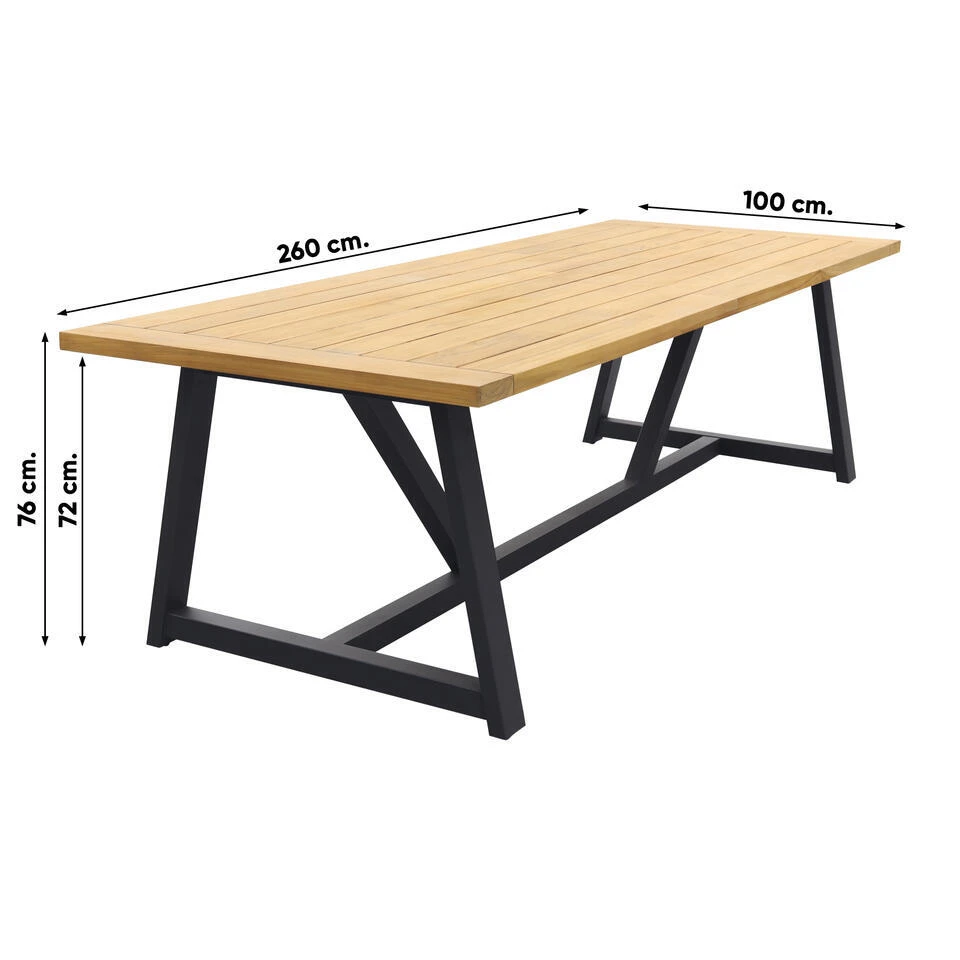 Ervaar het buitenleven in gezelschap van maximaal 6 personen aan de ruime Noah tuintafel van 260×100 cm. Deze tafel biedt niet alleen voldoende ruimte, maar heeft ook een prachtige uitstraling. Het unieke RVS frame in combinatie met het teakhouten blad geeft de tafel een industriële look.Roestvrij staal (RVS) vormt het frame van deze tafel, een duurzaam materiaal dat bestand is tegen roest en diverse weersomstandigheden, en eenvoudig te onderhouden is. Het teakhouten blad voegt een warme uitstraling toe en staat bekend om zijn stevigheid en duurzaamheid. Hoewel teakhout weerbestendig is, kan langdurige blootstelling leiden tot natuurlijke verkleuring. Dit kan voorkomen worden door het hout te behandelen met een teak protector. Het is echter niet nodig om teakhout af te dekken, aangezien dit ongewenste vlekken kan veroorzaken.
