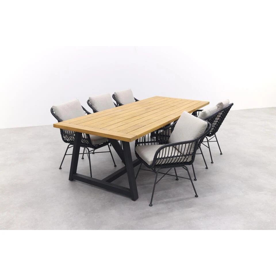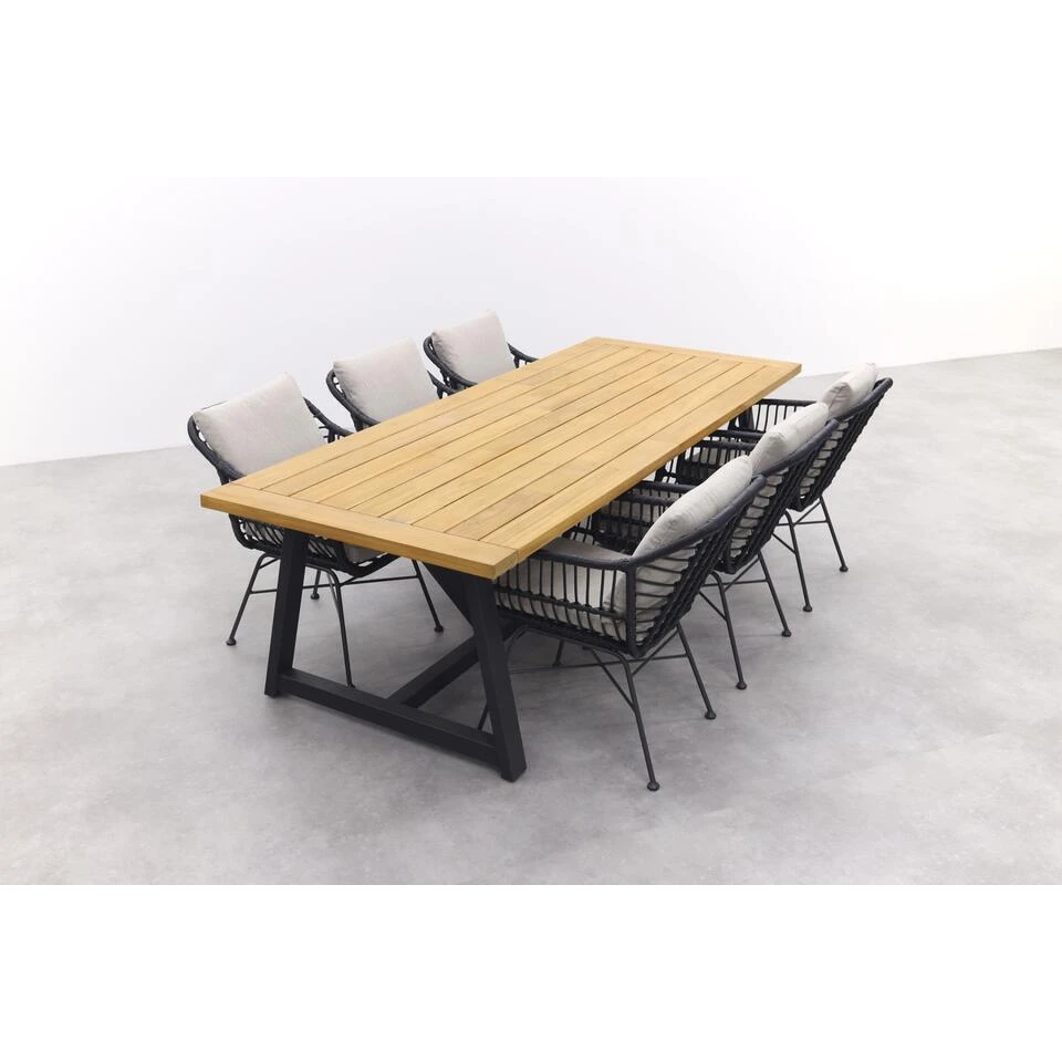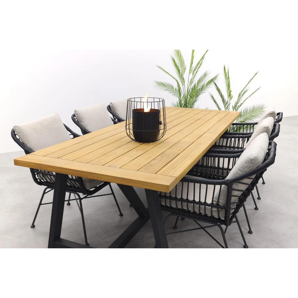 Geniet van een industriële uitstraling met de GI Margriet black/Noah tuinset. Door de royale Noah tuintafel van 260 cm x 100 cm geniet je met een gezelschap van 6 personen van het buitenleven. Ideaal voor bbq’s, borrels of diners in de tuin. De tuintafel geeft een warme uitstraling aan jouw buitenruimte door het prachtig afgewerkte teakhouten tafelblad. Dit tafelblad ligt op een uniek vormgegeven RVS frame. Comfortabel genieten doe je met deze tuinset door de Margriet tuinstoelen. Het tijdloze design met retro vibes past perfect bij deze set door het gebruik van zwart wicker. Bestel direct online! Liever eerst even proefzitten? Kom dan gezellig langs in onze showroom in Opheusden, Duiven of Apeldoorn. Je bent van harte welkom!