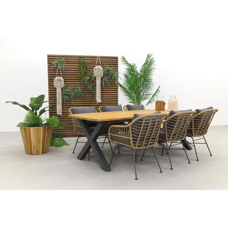 Op zoek naar een stoere industriële tuinset met een vintage touch? Dan is deze Margriet/Sefa combinatie de juiste tuinset voor jou! De Magriet tuinstoelen van Garden Impressions hebben een retro uitstraling die voortkomt uit het neutrale wicker dat gebruikt is. De tuintafel geeft die industriële look door het teakhouten tafelblad in combinatie met het aluminium x-frame. Het frame is in een mooie antracieten kleur wat perfect past bij het antraciteten frame van de Margriet dining tuinstoelen. Door de tafel lengte van 240 cm. heb je genoeg ruimte voor 6 personen. Perfect voor een groot gezin of veel vrienden of familie. Geen excuus meer om die borrelavond niet te gaan plannen.