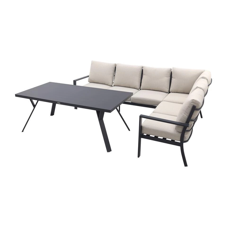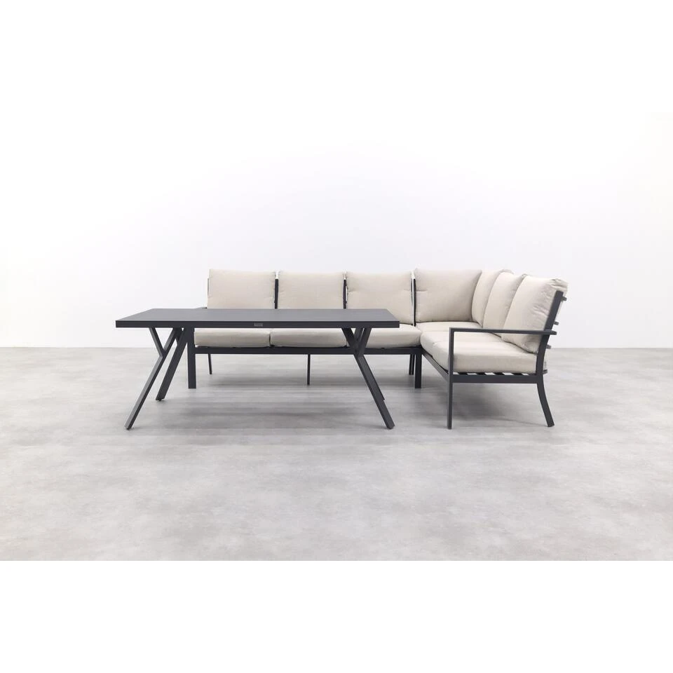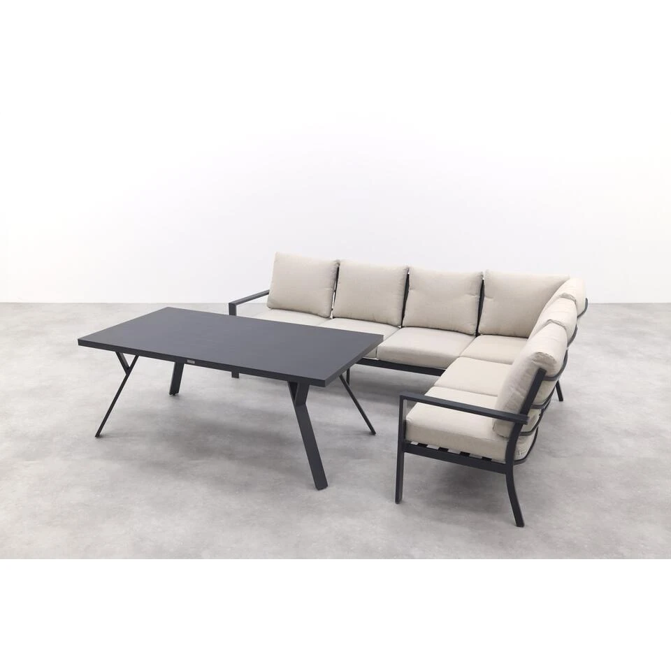 Zoek je een stijlvollen loungeset waar je ook comfortabel aan kunt eten? Dan is de Sergio lounge diningset een perfecte keuze! Deze loungeset heeft een elegante en moderne uitstraling. Dit komt mede door het mooie contrast tussen het zwarte frame en de zandkleur die ‘Desert’ is gedoopt. Geniet van het beste van twee werelden: loungen en dineren in één. Deze set biedt comfortabel plaats aan 5 tot 6 personen. Als je extra zitplaatsen wilt toevoegen bekijk dan eens de Sergio diningstoel. Je besteld deze loungeset gemakkelijk online! Liever eerst even proefzitten? Kom dan langs in onze showroom in Opheusden, Duiven of Apeldoorn. je bent van harte welkom!