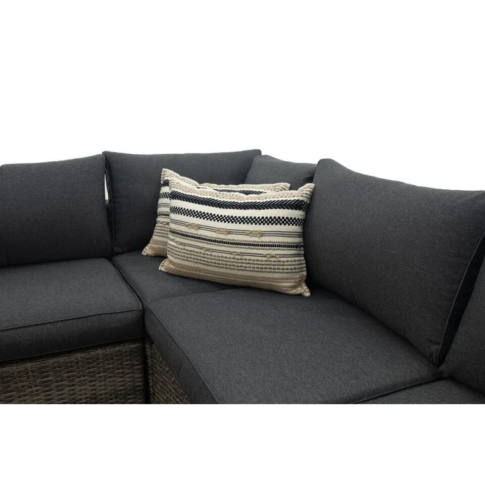 De set heeft een aluminium binnenframe, omhuld met handgevlochten kunststof vlechtdraad. Het dubbele draad heeft een luxe uitstraling en is sterk, onderhoudsvriendelijk en bestand tegen verschillende weersomstandigheden. De kussens worden standaard meegeleverd. Dankzij de vuil- en waterafstotende coating kunnen de kussens een klein regenbuitje prima verdragen.